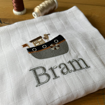Een witte hydrofiele doek, geborduurd met een persoonlijke illustratie geïnspireerd op het geboortekaartje. Een zacht én uniek herinneringsstuk. Heb jij ook een speciaal verzoek of een leuk idee voor een illustratie? Neem gerust contact met ons op, we denken graag met je mee!