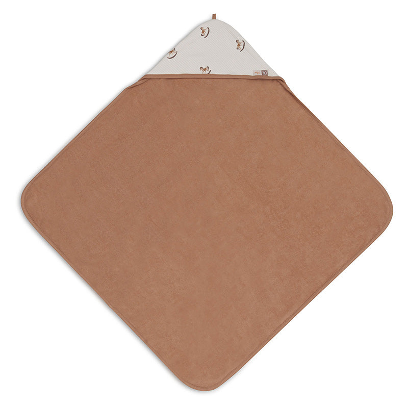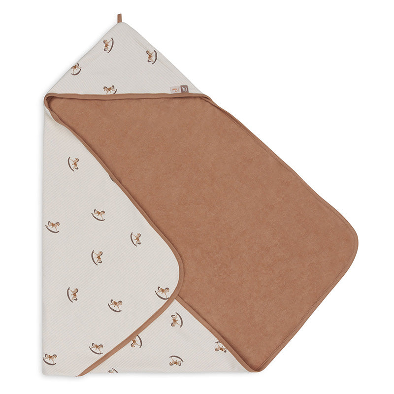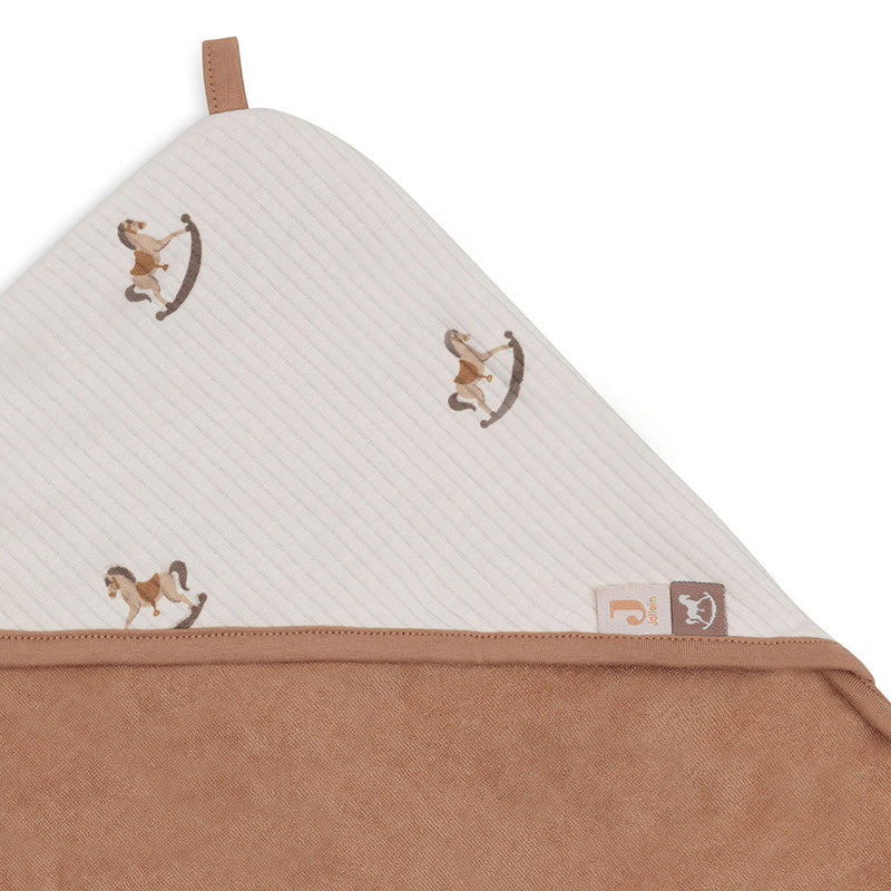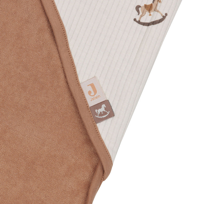 Maak van het afdrogen een gezellig moment met deze prachtige badcape in het Nostalgic Ride thema van Jollein. De badcape heeft een stijlvolle buitenkant met een speels hobbelpaardjesmotief in oatmeal ribstof en een zachte binnenkant van terry badstof in biscuitkleur. Het bijpassende biesje maakt de afwerking helemaal compleet.